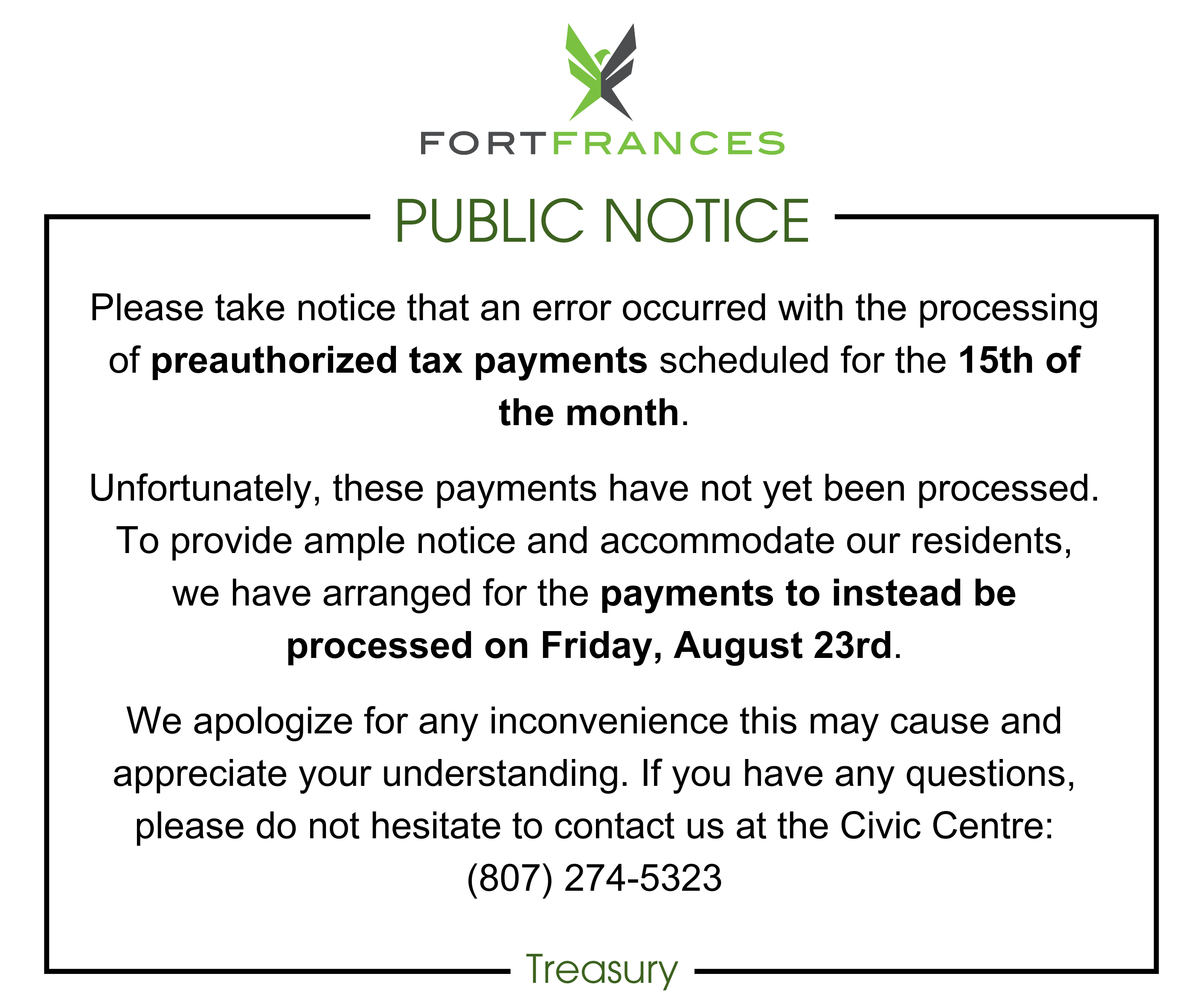 Please take notice that an error occurred with the processing of preauthorized tax payments scheduled for the 15th of the month. Unfortunately, these payments have not yet been processed. To provide ample notice and accommodate our residents, we have arranged for the payments to instead be processed on Friday, August 23rd. We apologize for any inconvenience this may cause and appreciate your understanding. If you have any questions, please do not hesitate to contact us at the Civic Centre: (807) 274-5323.