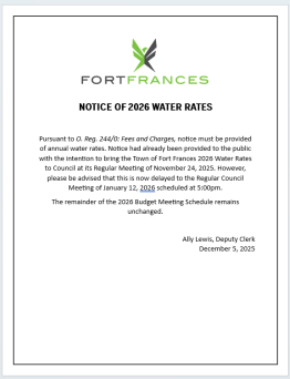 Notice is given of the meeting time for the Regular Meeting of Council on Monday, December 8th, 2025 which is scheduled for 5:30pm (1730 hours).
