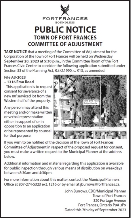 TAKE NOTICE THAT The Town of Fort Frances Council at its Regular Council Meeting of August 14, 2023 approved the 2024 Budget Schedule.