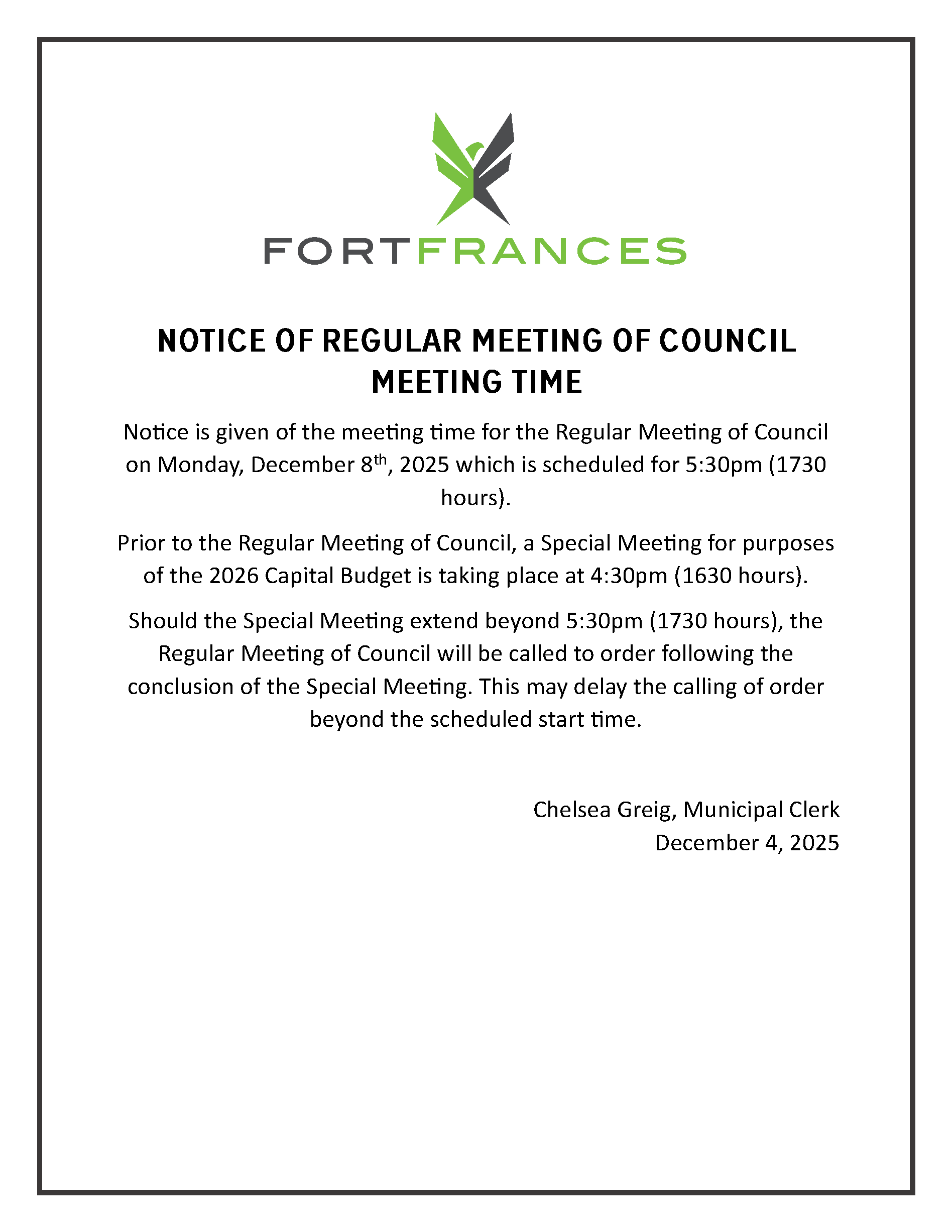 Notice is given of the meeting time for the Regular Meeting of Council on Monday, December 8th, 2025 which is scheduled for 5:30pm (1730 hours).