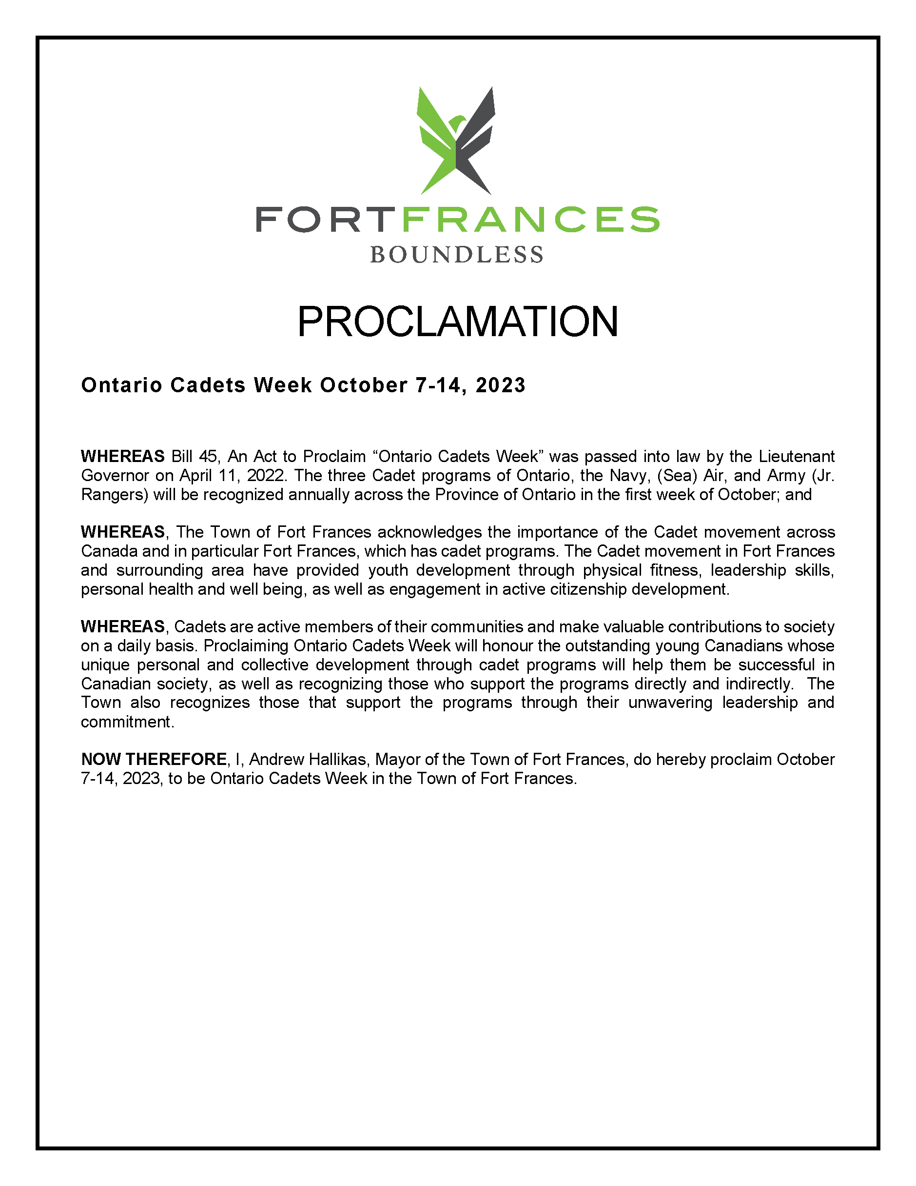 • Proclamation Ontario Cadets Week