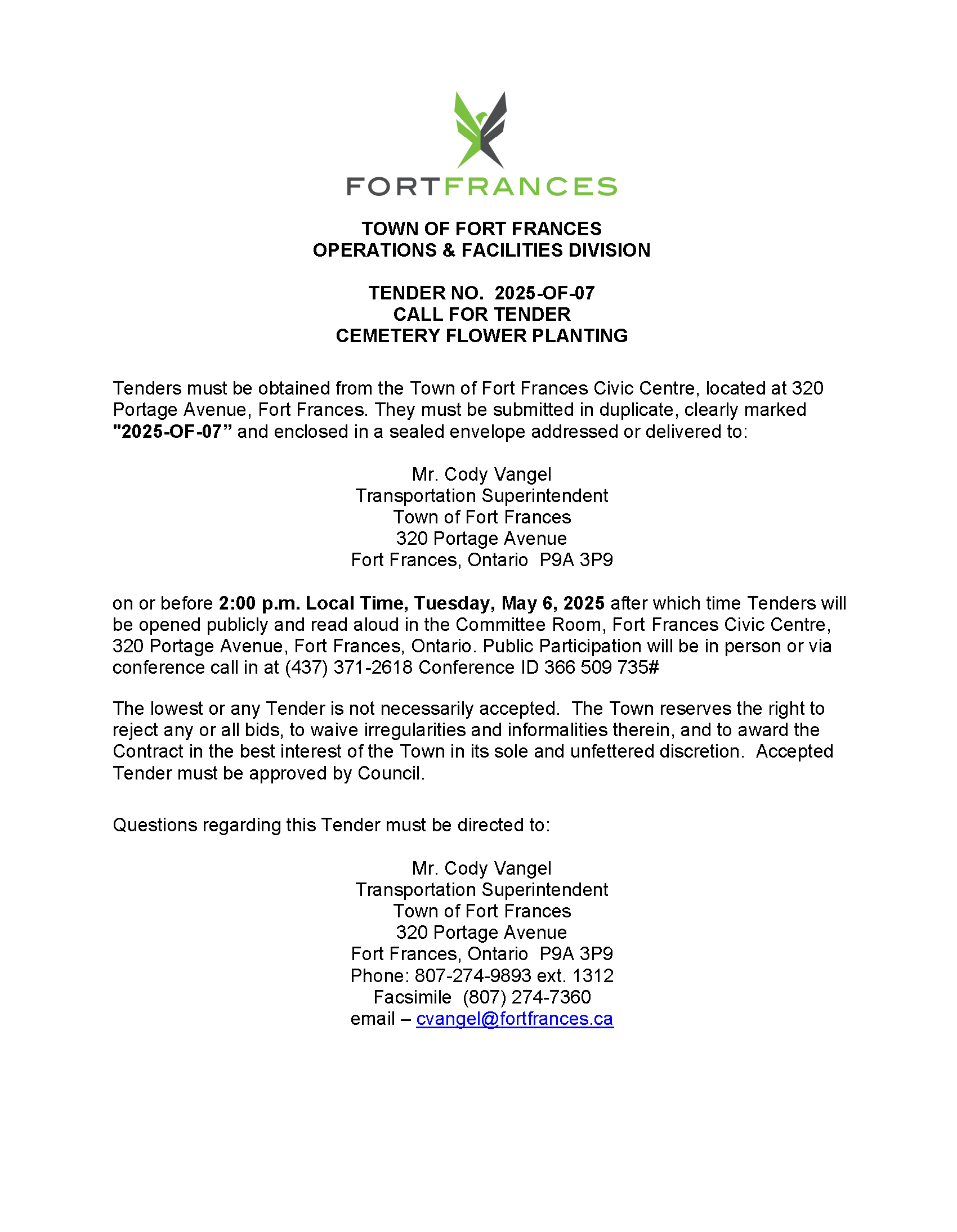 on or before 2:00 p.m. Local Time, Tuesday, May 6, 2025 after which time Tenders will be opened publicly and read aloud in the Committee Room, Fort Frances Civic Centre, 320 Portage Avenue, Fort Frances, Ontario. Public Participation will be in person or via conference call in at (437)371-2618 Conference ID 366 509 735#